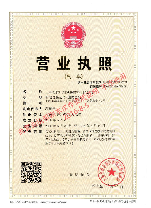 上海奕程印刷包裝材料有限公司 地址:上海浦東新區(qū)華夏東路4220號